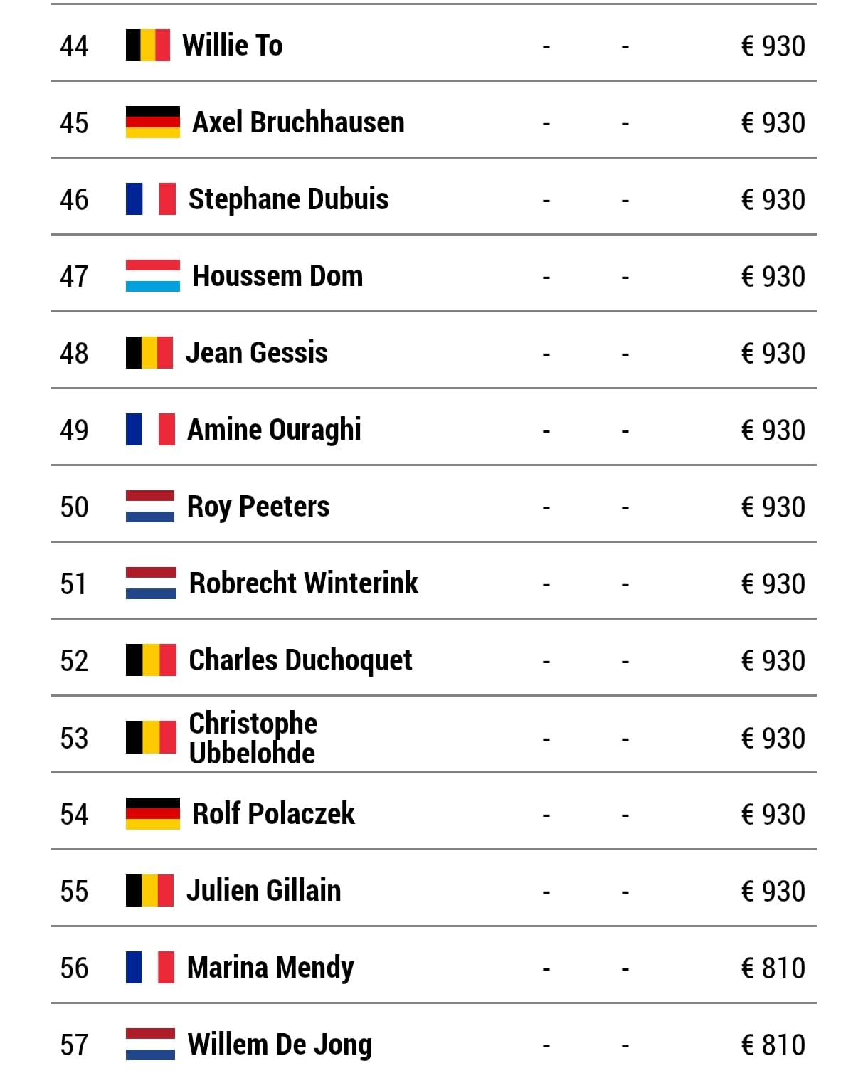 Belle journée aussi pour Lukas Trzcinski qui aura 46 blindes à la reprise sur 5000 - 10 000 (10 000), à deu heures de jeu de l'argent. Willem de Jong (29bb), Raphael Canta (24bb), Leroy Aussems (29bb), Jhonn Lienard (23bb) Aaron Wrighting (23bb), Patrick Hutsch (18bb), Sabrina Senden (14bb) ont aussi assuré l'essentiel...