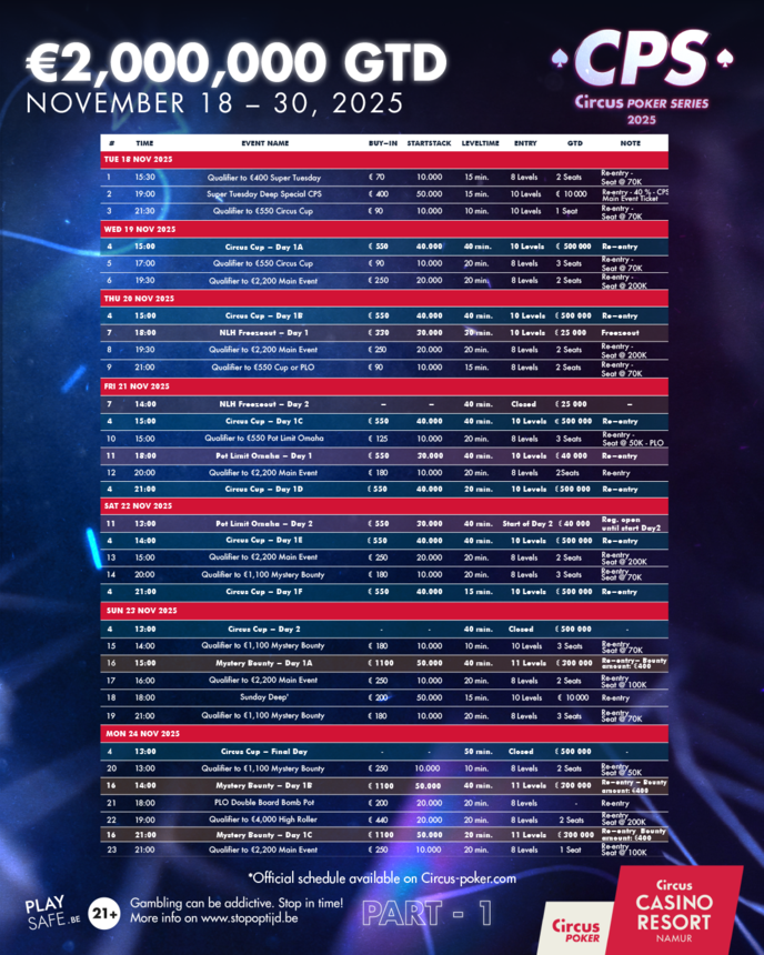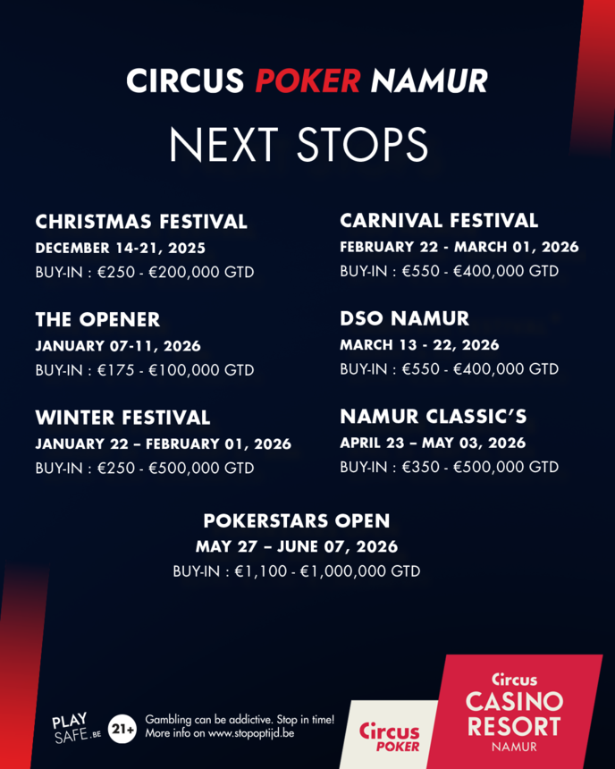 Sponsored by PokerStars and held at the Circus Casino Resort Namurthe Circus Poker Series returns for its third edition, running from November 18 to 30.