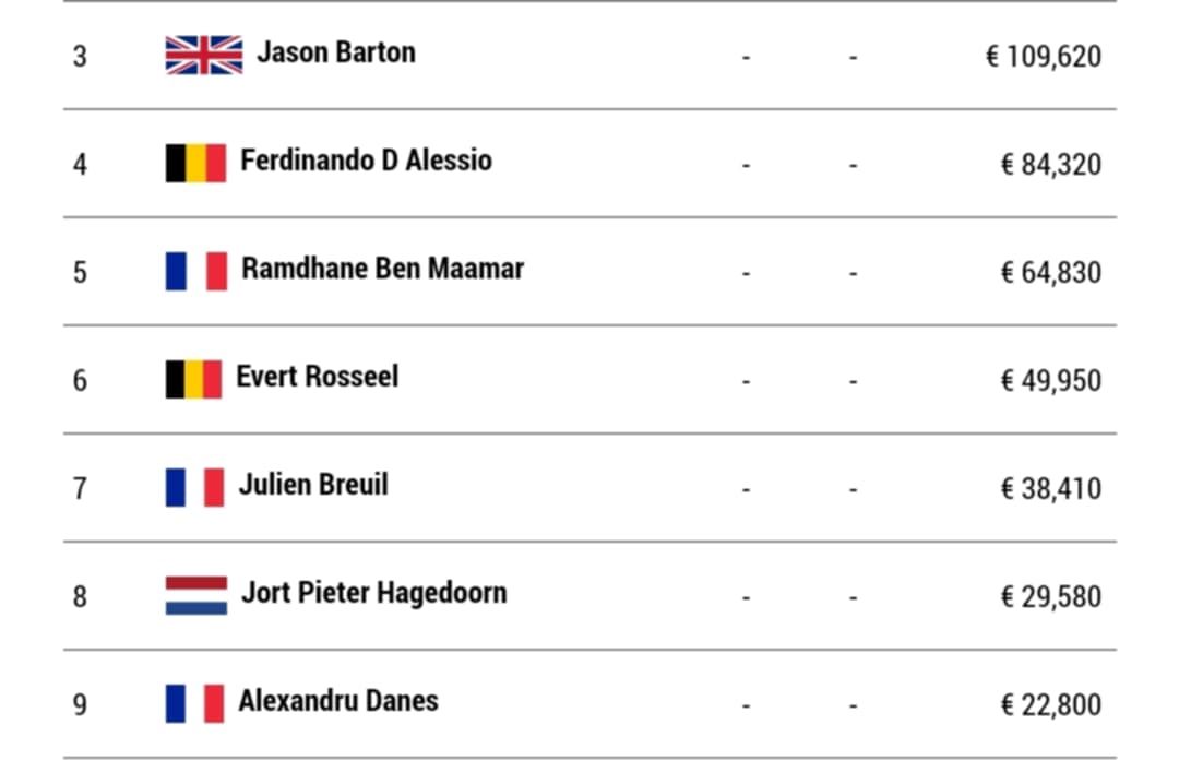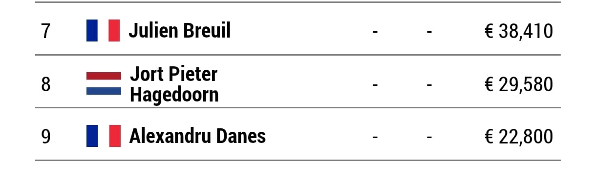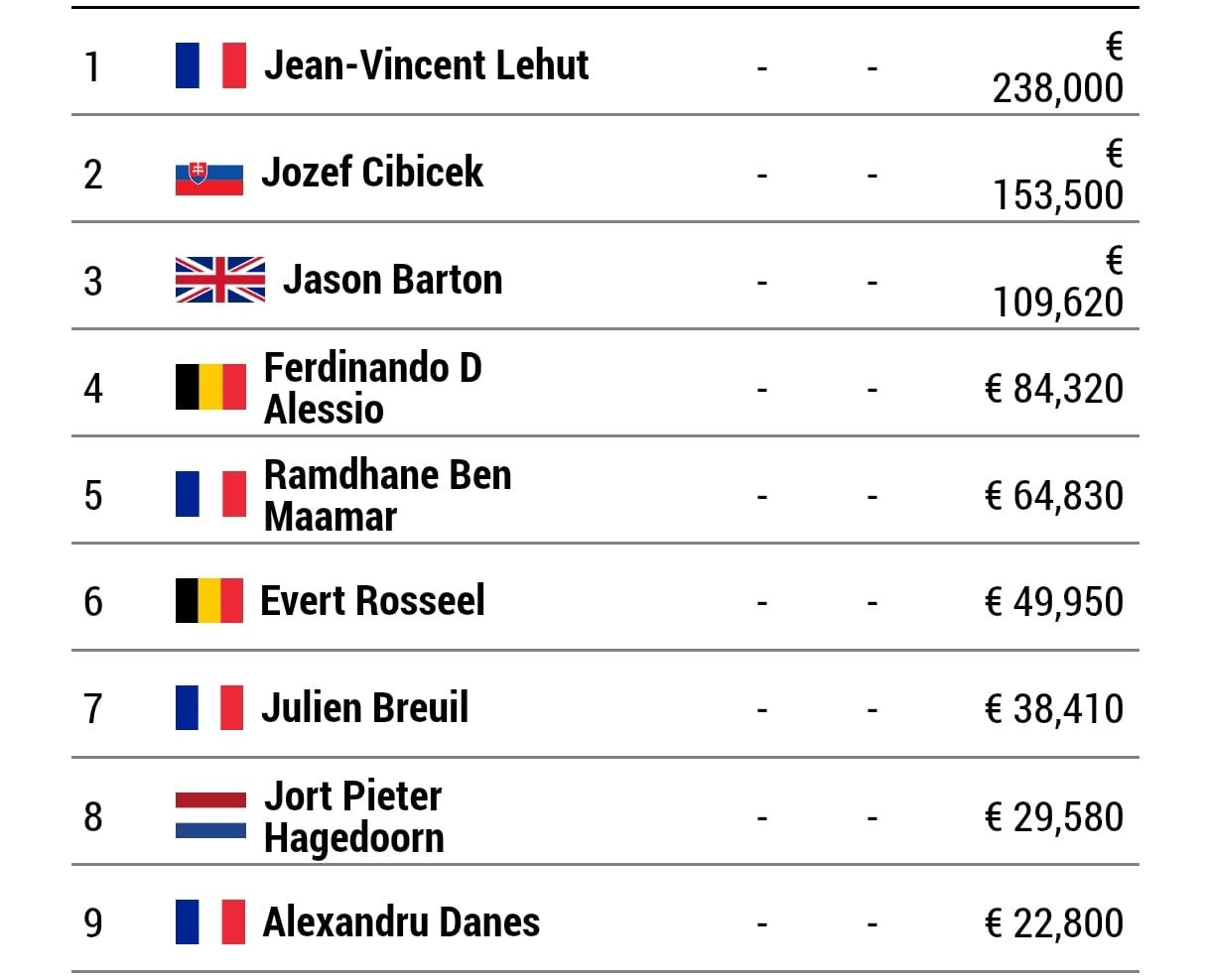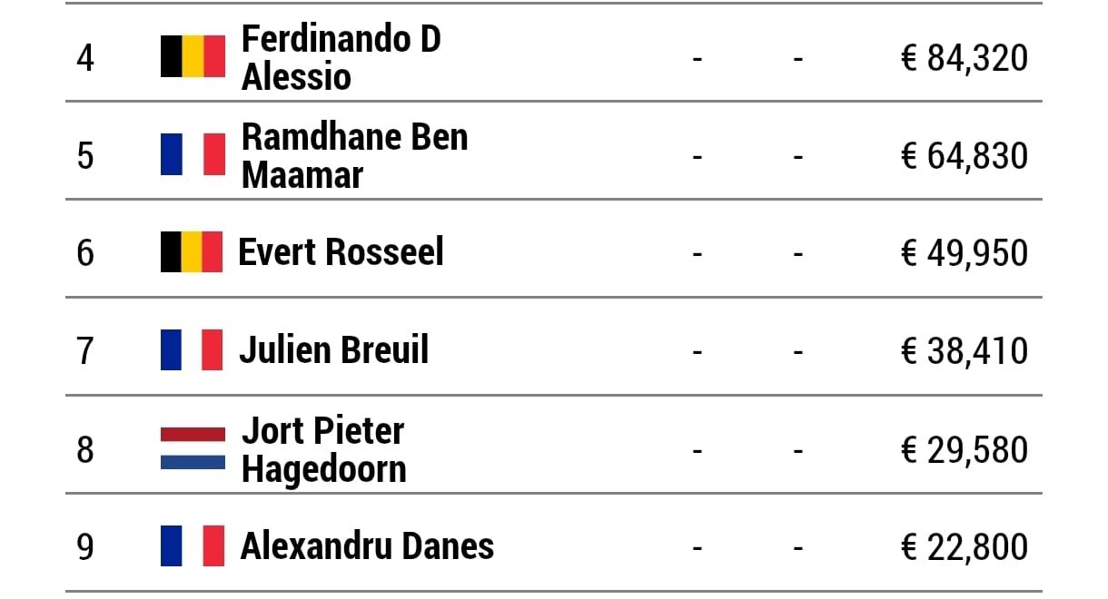 10e - Pascal Vos 8 240€ 11e - Jan Bobbaers 3 240€ 12e - Thomas Clack 4 220€ 13e - Riccardo Bonelli 4 220€ 14e - Gerard Carbo 7 370€ 15e - Fried Raez 6 370€ 16e - Artus Leyva 3 070€ 17e - Royshi Katsumata 2 070€ 18e - Andy Keuninckx 1 810€ 19e - Wim Verhaegen 1 810€ 20e - Julien Ghezala 2 310€ 21e - Greg Feyants 2 070€ 22e - Kevin Fluegel 22 570€ 23e - Gerald van Tright 4 570€ 24e - Ken Claessens 1 360€