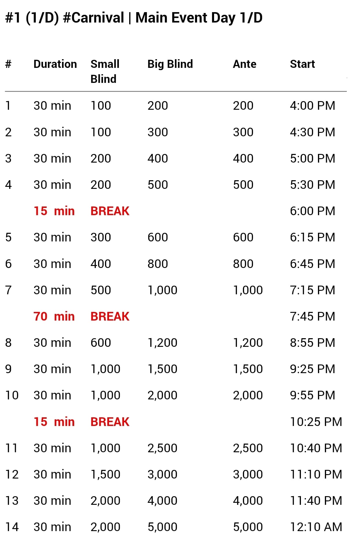 Pas de pause dîner sur la journée d'ouverture avec 5 levels avant un break d'un quart d'heure puis de nouveaux 5 niveaux avec un break de 15 minutes marquant la fin des inscriptions tardives. Il restera alors une heure de poker à disputer, direction l'emballage des jetons vers 1 heure du matin pour les survivants.