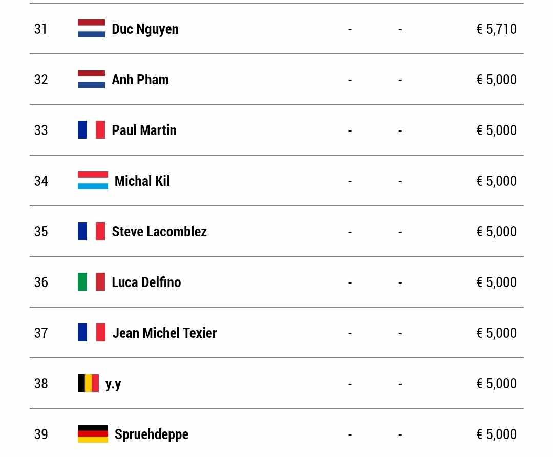 Il reste 5 Belges, 6 Allemands, 9 Français, 2 Néerlandais, un Britannique et un Coréen dans cette partie... avec aussi deux champions EPT et un vainqueur WSOP!