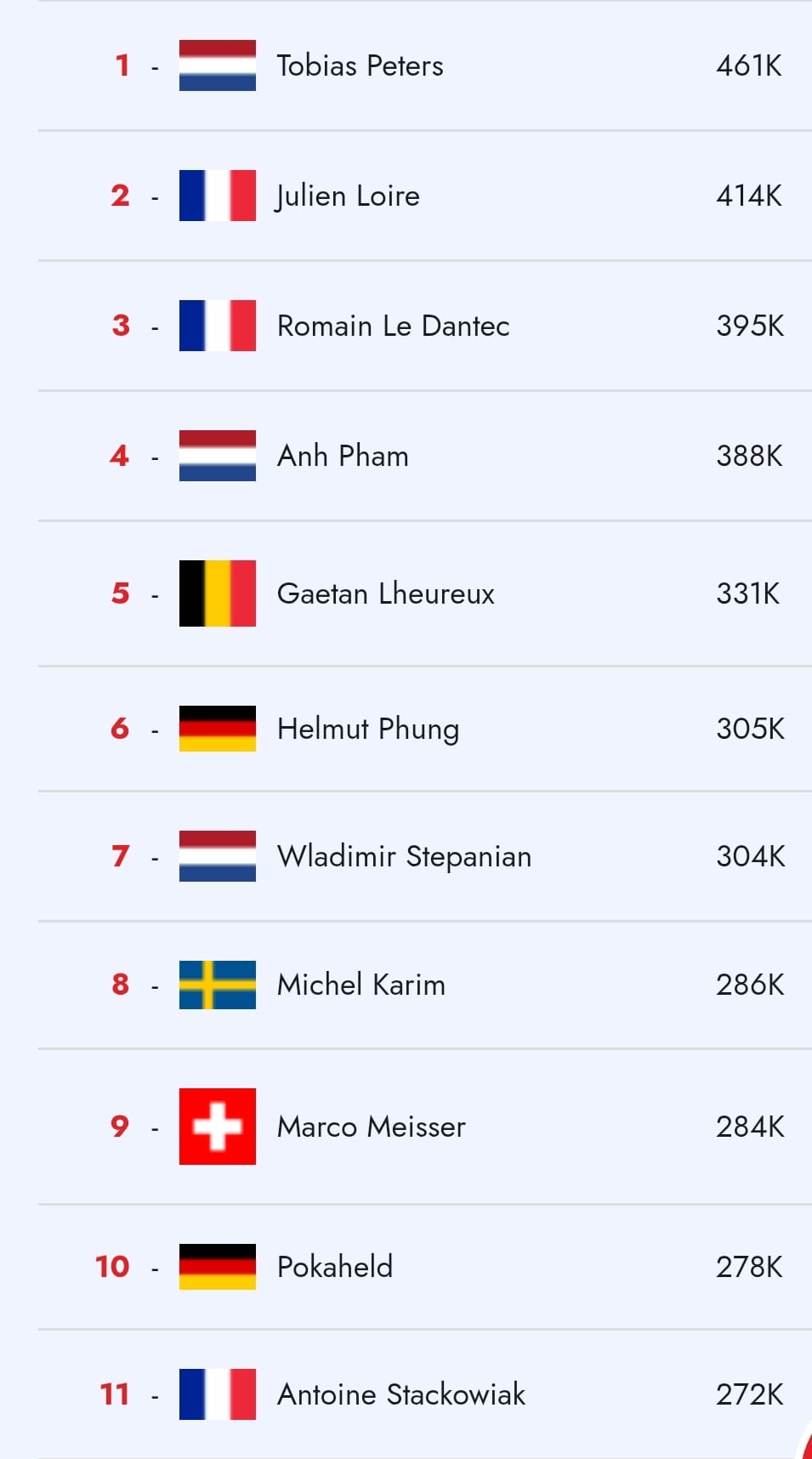 Ce sont donc pour le moment 74 joueurs qui ont un ticket pour le Jour 2 avec 234 entrants sans compter l'ultime flight. L'affluence provisoire est de 283 entrants, pas encore de quoi atteindre la garantie qui sera honorée par le Circus Casino Resort de Namur quoi qu'il arrive !