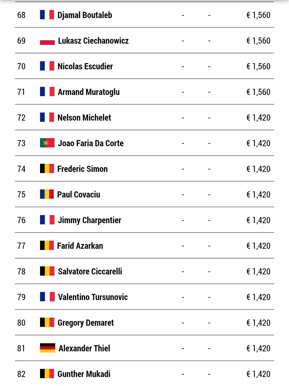 Julien Mariani (660 000) a fait le boulot depuis l'entame à 13 heures, cea devrait le faire pour l'argent tout comme pour Wellington Lessa Guedes (300 000), Benoit Grobocopatel (480 000), Rayane Moktavarium (530 000), Fabir Cardenia (500 000), Harrie Snijders (500 000), Nelson Michelet (600 000 - photo) ou Zhong Chen (500 000).