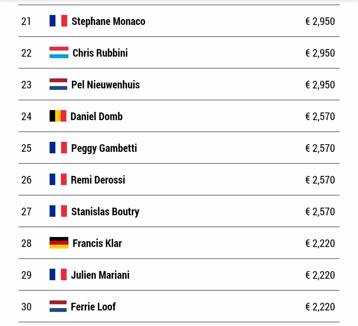 La moyenne est à 310 000 jetons, cela devrait donc le faire pour Chris Rubbini (330 000), Hervé Decker (730 000), Ludovic Ruperto (760 000), Wellington Lessa Guedes (610 000), Etienne SIlva de Oliveira (480 000), Olivier Armougeon (500 000), Sabrina Senden (400 000), Rico Roumen (310 000) ou Omar Lakhdari (310 000) qui avait 10 blindes à la reprise.