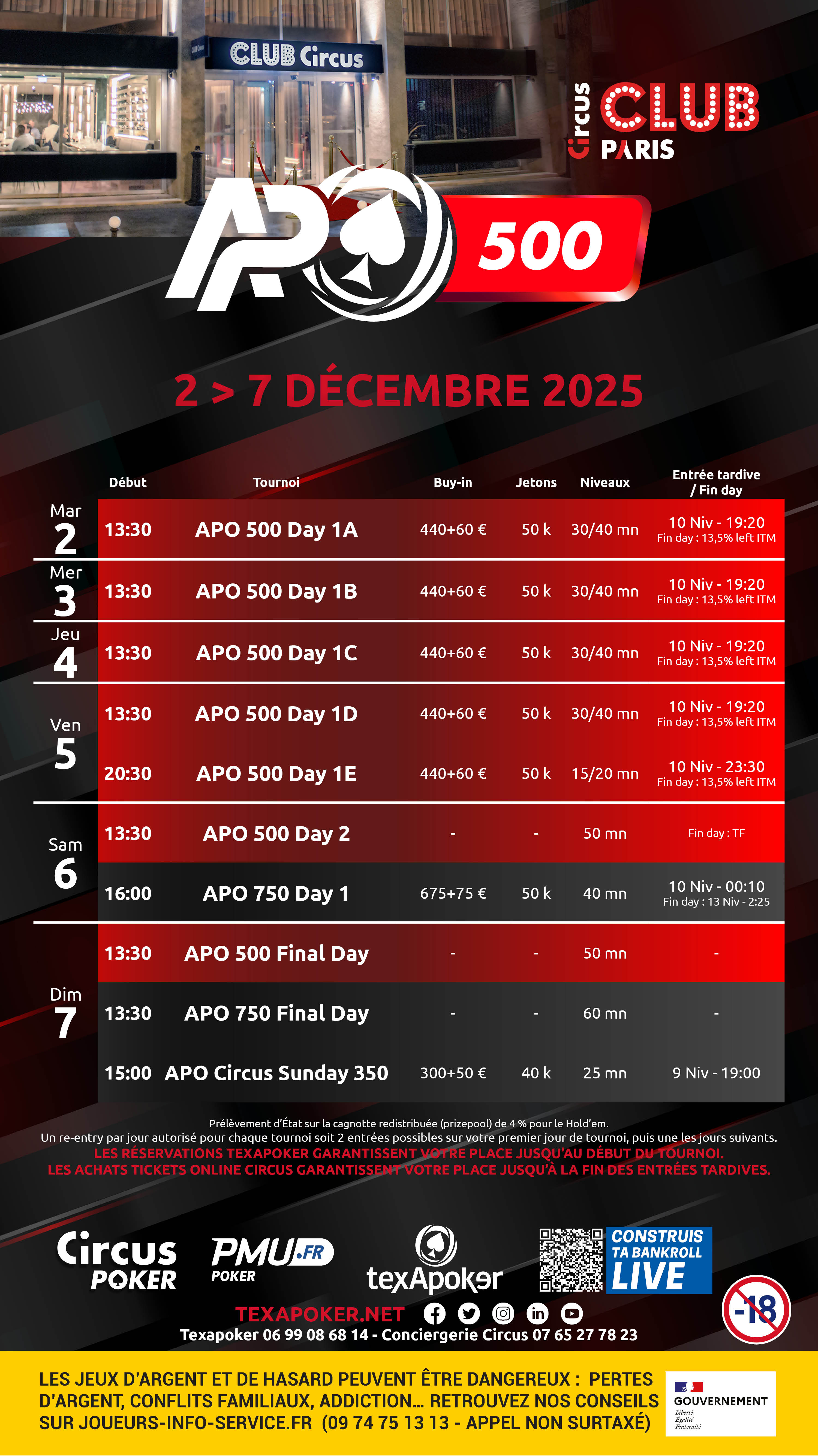 🚨 Un Main Event à 500€ avec 5 day1, un High Roller à 750€, et le traditionnel APO SUNDAY CIRCUS 350 en clôture ... Un programme hors normes qui n'attend que vous 💪