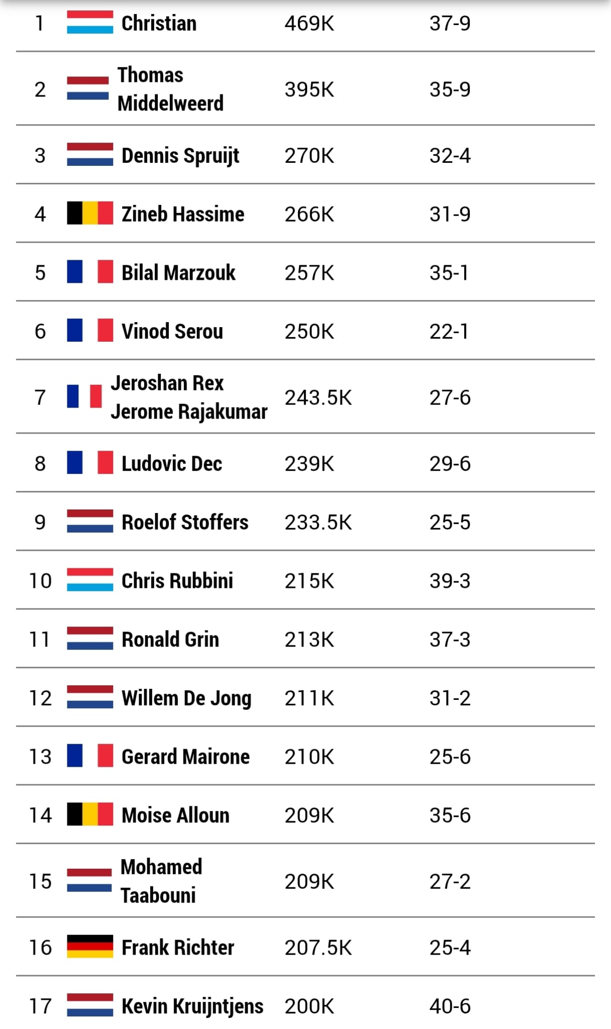 Chipleader à l'issue du Jour 1, le Luxembourgeois Christian est toujours là aussi tout comme Bilal Marzouk, Jeroshan Rex, Damien Di Pasquale, Eric Geraume, Stephan Perings, Harrie Snijders, Luc Boeckx, Julien Varin, Adrien Brihaye, Francesco Lauria, Gilles Anonymous ou Johann Comapgnon et Bryan de Riddere....jpg)