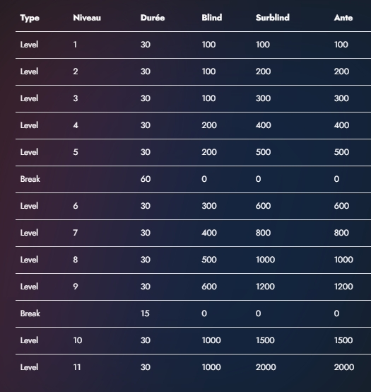 Reprise à 21 heures 30 sur les blindes 300 - 600 (600) avec pour le moment 157 joueurs en lice et une moyenne à 63 000 jetons. Rien de rédhibitoire pour les retardataires !