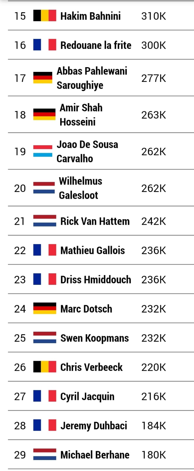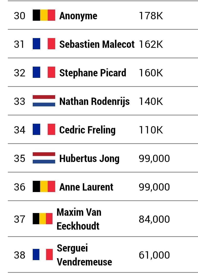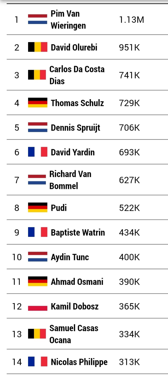 Cela se asse mieux pour Samir Chebaane (425 000), Will de Jong (345 000), Stéphane Monaco (410 000), Christoph Zimmermann (450 000), Kader Slila (350 000), Chris Rubbini (330 000, Zeki Elmas (430 000)... ce joli petit monde restant à bonne distance de Nicolas Capoulade(650 000), Roelof Stoffers (605 000) et surtout Frank Richter (770 000), le chipleader !