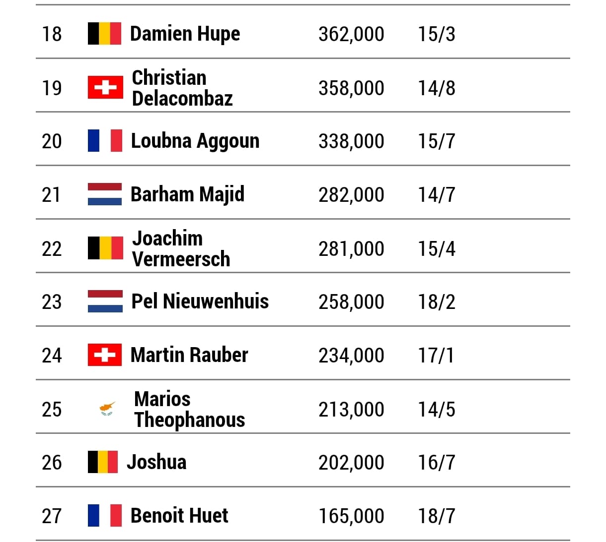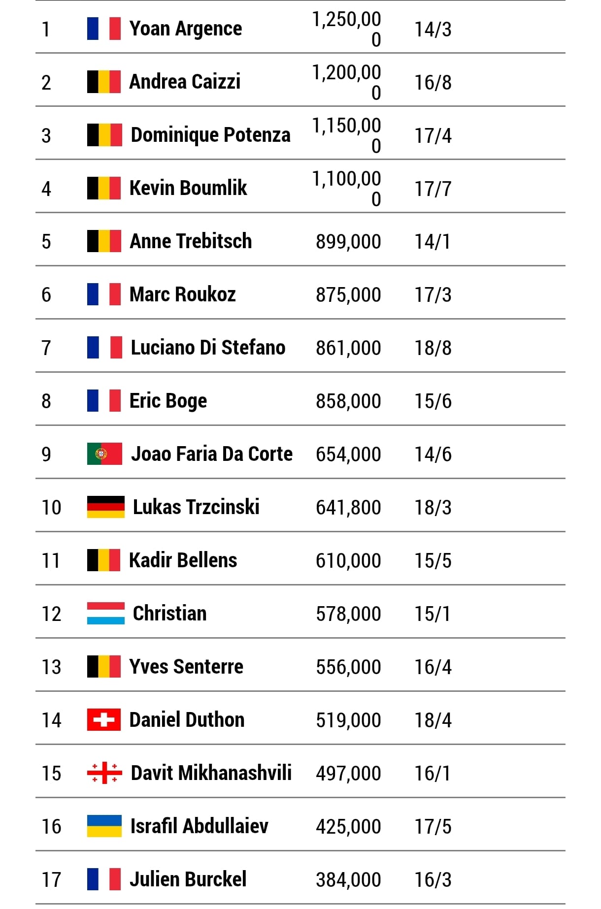 Les joueurs ont usé la structure puisqu'il a fallu tomber à 20 blindes de moyenne pour voir le tournoi se décanter. Il a falu plus de quatre heure pour qu'un trio belge ne rende les armes avant l'argent. Joachim Vermeersch a finalement été le dernier à repartir les mains vides. De quoi permettre un min-cash de plus à Damien Hupé en Eric Boge !