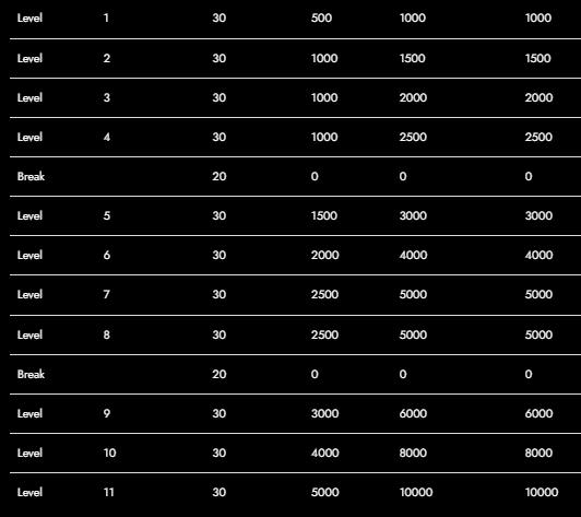 11 niveaux d'une demi-heure avec une fin vers 1 heure 10 du matin... reprise jeudi à 14 heures avec des levels allongés et jusqu'à 14 heures 40 pour re-entry ou s'inscrire in-extremis ! La garantie va sauter avec déjà 58 entrants.