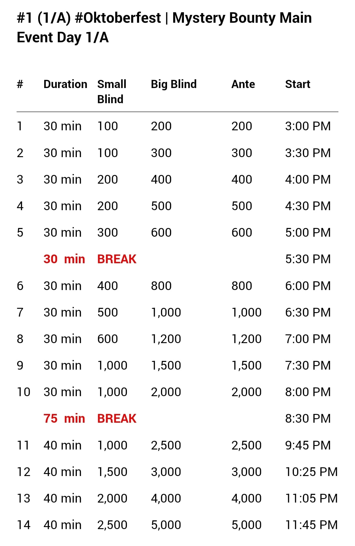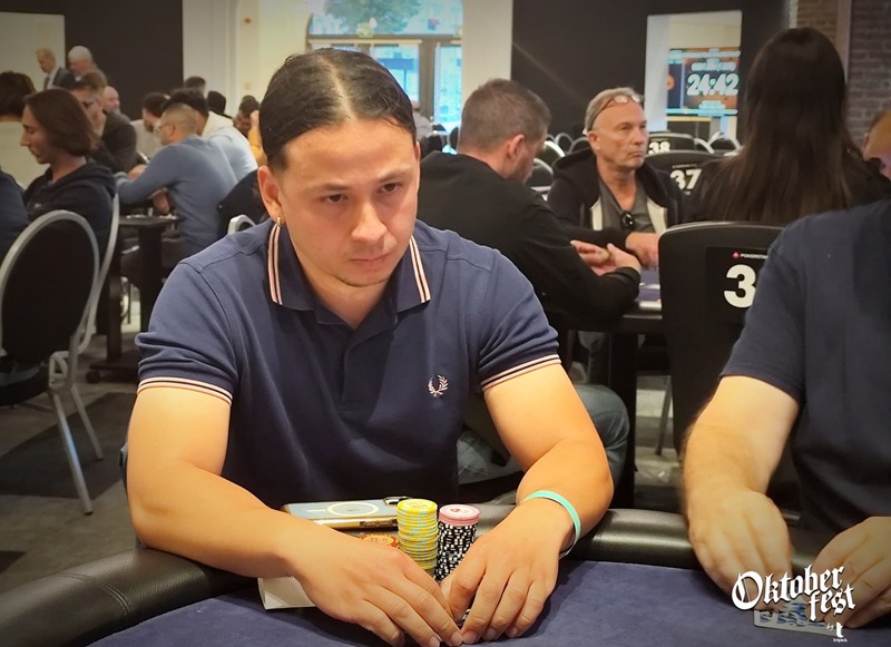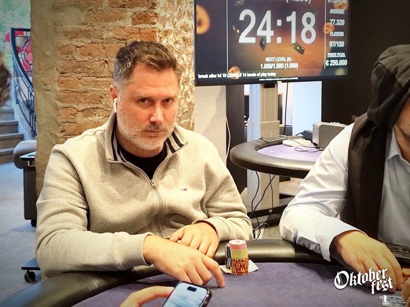 De blinds worden verhoogd naar 600 - 1200 (1200) voor de achtste van 14 levels op Dag 1A van het Oktoberfest, wat een prijzenpot van €250.000 garandeert... Het gemiddelde is 74.000 chips met 98 spelers in de running voor 146 inschrijvingen !