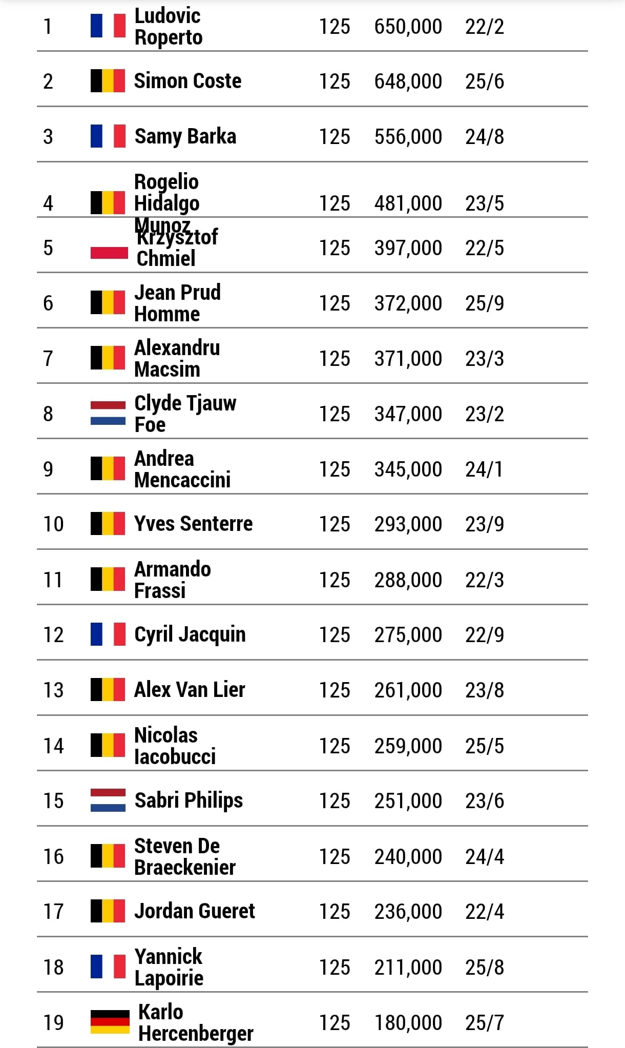 Rogelio Hidalgo (481.000) en Krysztof Chmiel (397.000) maakten de Top 5 compleet, terwijl Jean-François Prud'Homme (372.000), Alexandru Macsim (371.000), Clyde Tjaw Foe en Yves Senterre de dag afsloten in de voorlopige Top 10...
