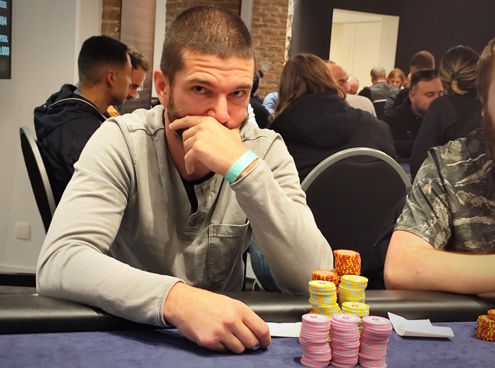 Macsim Alexandru (foto) had 235.000 pionnen bij de pauze, de schuld van een enorme badbeat die hij vasthield aan Luciano Tiepido... Deze laatste had net de 100 chips van de hele tafel gekocht toen hij 6 en 9 van klaveren verdedigde in de grote blind om een 5 7 8 flop te vinden met een klaveren.