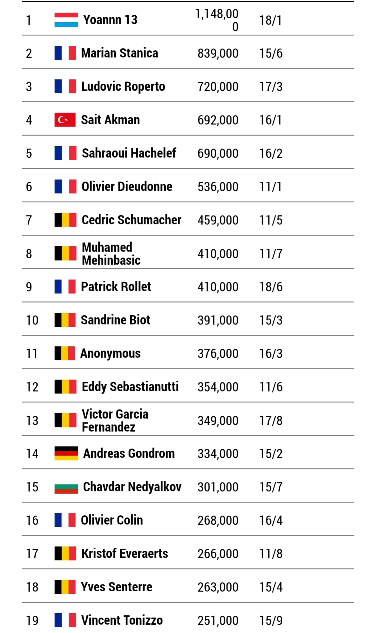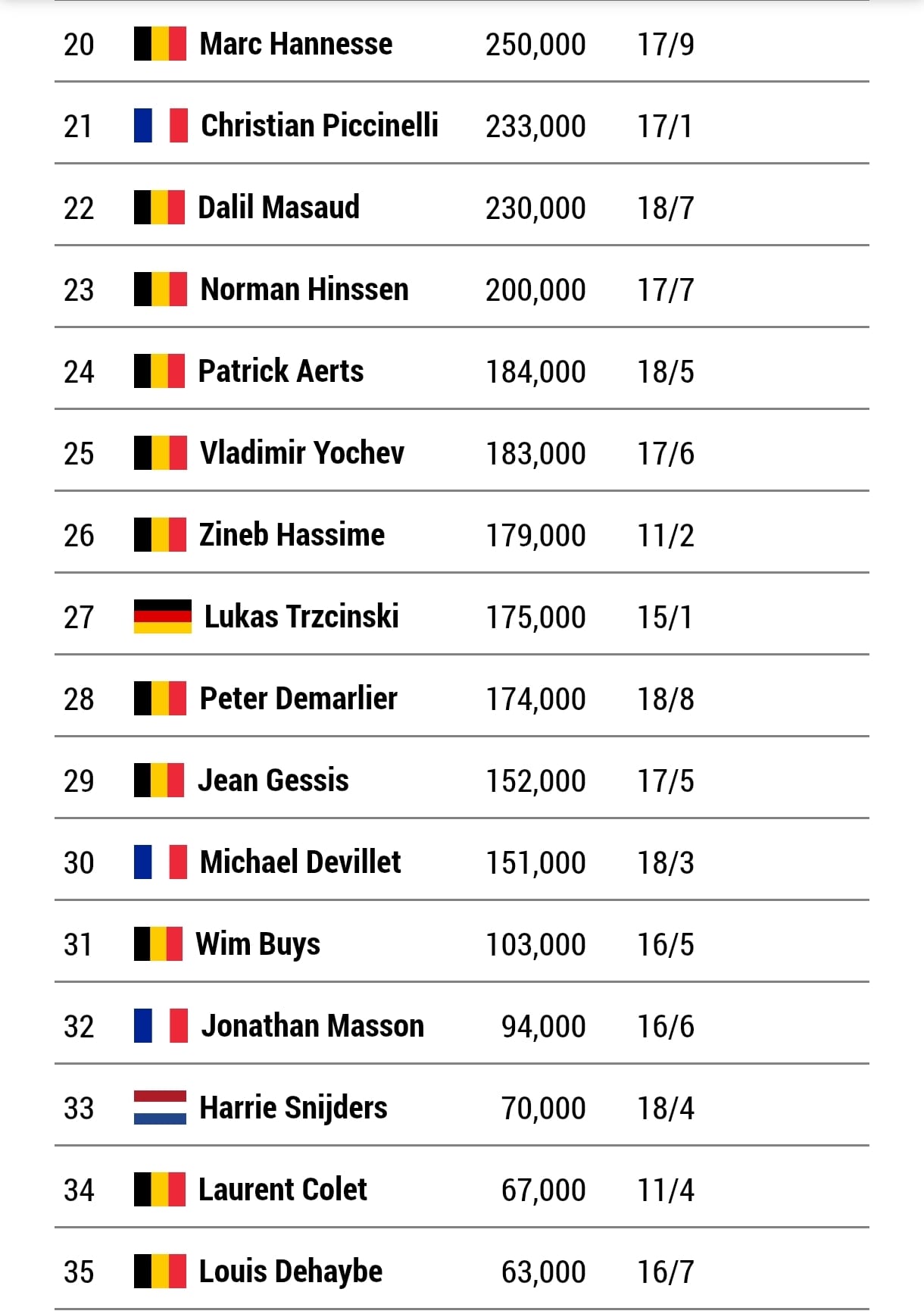 Job Cozjin (315 000) porte bien son prénom pour le moment, ca se passe bien aussi pour Ludovic Ruperto (310 000) et Kristof Everaerts (380 000), tout juste 20e de l'Oktoberfest il y a quelques semaines...