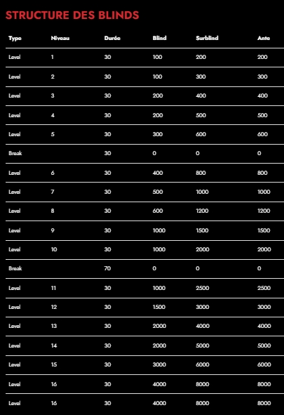 La partie se joue sur les blindes 1500 - 3000 (3000) pour encore une petite dizaine de minutes et si les niveaux de 30 minutes défilent, il y a encore 53 blindes de moyenne...